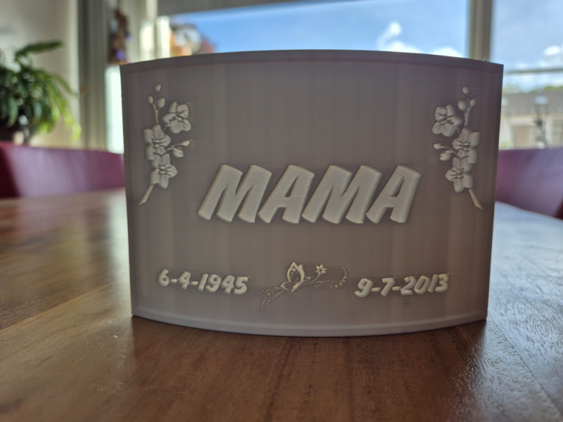 Dit 3D-geprinte herdenkingslichtje is speciaal ontworpen om een dierbare te herinneren. Het subtiele ontwerp straalt warmte en rust uit en is perfect geschikt om een waxinelichtje of LED-lichtje in te plaatsen.